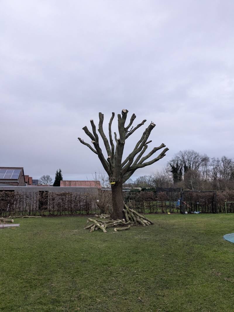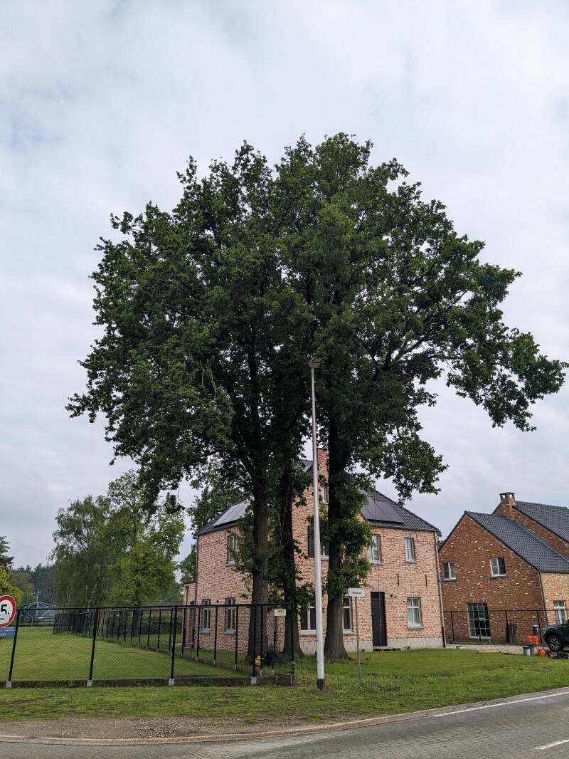 Deze zomereiken gaven een volle schaduwvlek op de woning. Door de bomen voor 20 % uit te dunnen creëren we meer diffuus lichtinval.